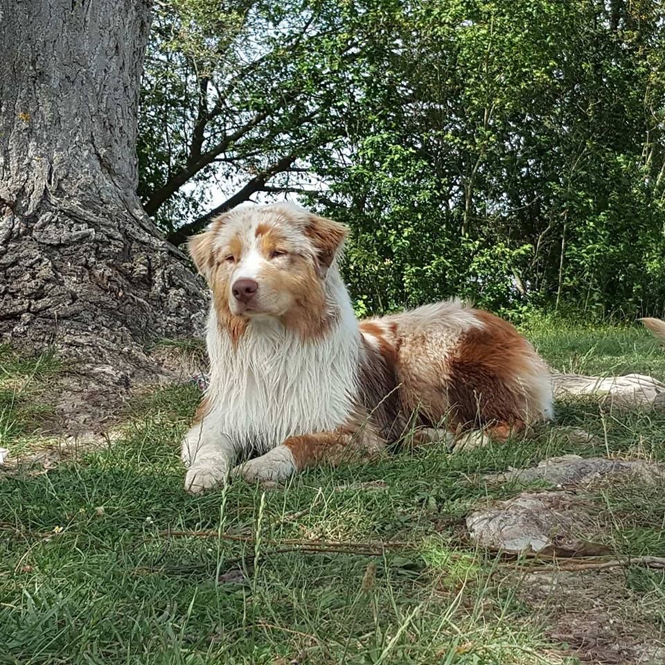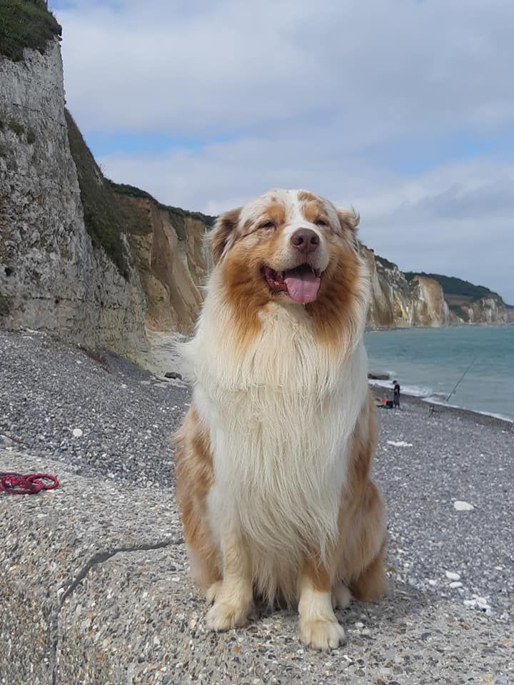 Un gros nounours de 30kg et 57cm au garrot. Il vit chez une amie.Collé et très fusionnel avec sa maitresse, calme et très sociable. Il vit chez une amie et ses enfants avec 3 autres australiens, des chats, poules....